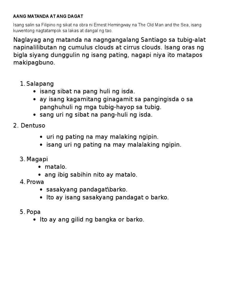 From professional translators enterprises web pages and freely available translation repositories. Isinalin sa Filipino mula sa Ingles ni Jesus Manuel Santiago The Old Man and the Sea ni Ernest Hemingway bahagi lamang 1 Talasalitaan. Tunghayan ang istorya ng isang matanda at ang kanyang pakikipagsapalaran sa dagat Ps.