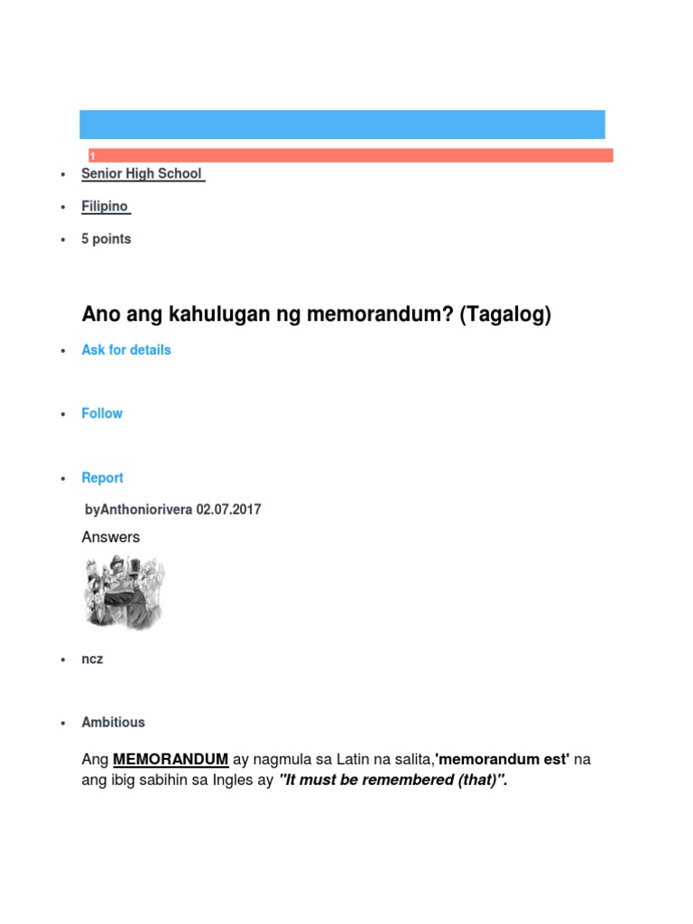 In law a memorandum is a document recording the terms of a contract or other legal details. Results for memorandum kahulugan translation from Tagalog to English. 59 nagtatadhana ng siyam 9 na yunit na pangangailangan ng Filipino sa pangkalahatang edukasyon at nagbabago sa deskripsyon at nilalaman ng mga kurso sa Filipino Sining sa Pakikipagtalastasan Filipino 2 Pagbasa at Pagsulat sa Ibat Ibang Disiplina at Filipino 3 Retorika.